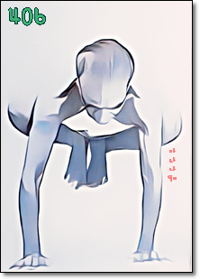 - 숨을 내쉬며, 몸통을 위로 올리며 머리를 바닥에서 뗀다(그림 408). 팔을 뻗어서 바로 펴고 엉덩이를 들어 올린다(그림 409). 목을 뻗고 머리를 최대로 높이 든다(그림 410).