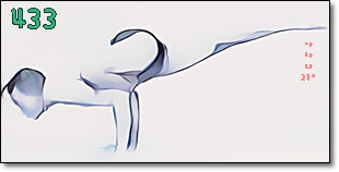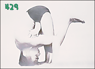 - 몇 번 깊은 호흡을 하고, 이 아사나를 되풀이한다. 이번에는 왼쪽 다리를 반 파더니 아사나를 취하는데, 이때 왼발은 오른쪽 팔 상부의 뒷면에, 왼쪽 무릎은 왼쪽 팔 상부의 뒷부분에 놓고, 머리를 바닥에서 올린다(그림 432, 433). 양쪽에서 같은 시간 동안 머무른다. 싫으사 아사나로 다시 돌아온다.
