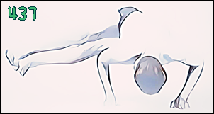 - 균형을 잡고, 몇 번 호흡한다. 그리고 숨을 내쉬며 양손으로 바닥을 단단히 누르고, 바닥에서 머리를 들어 올린다(그림 437). 몸통을 들어 올리고, 목을 쭉 뻗는다(그림 438). 이것이 최적 자세로, 다리가 공중에서 거의 바닥과 수평을 이루고 있을 것이다. 몸통이 수평으로 틀리기 때문에, 호흡이 빨라질 것이다. 가능한 한 오래도록 약 10~20초간은 균형을 잡는다. 다리를 대지 않은 왼쪽 팔과 왼쪽 어깨에 강한 긴장이 올 것이다.