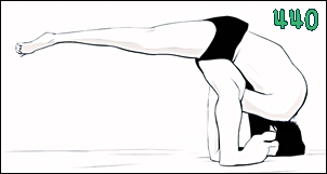 - 숨을 내쉬며, 머리를 바닥 위로 올리고, 팔을 뻗어서 손으로 균형을 잡는다. 두 다리를 곧게 펴고 무릎에 힘을 준다(그림 411). 이것이 최종 자세이다. 정상 호흡을 하면서 30초까지 최대한 이 자세로 있는다.