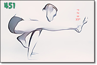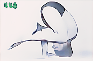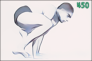 - 숨을 내쉬며, 몸통을 들어 올리고, 머리를 바닥에서 떼고, 복을 앞으로 쭉 뻗는다(그림 449-450). 오른쪽 다리를 앞으로 가져와서 바닥에 닿지 않은 채 똑바로 뻗는다. 팔을 곧게 펴고 균형을 잡는다(그림 451).