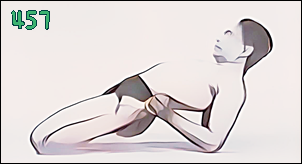 - 숨을 내쉬며, 바닥에서 엉덩이를 들고(숨을 457), 넓적다리를 위로 끌어올려 몸통을 아치형으로 만든다. 이때, 바닥 위에 정수리를 댄다(그림 458).